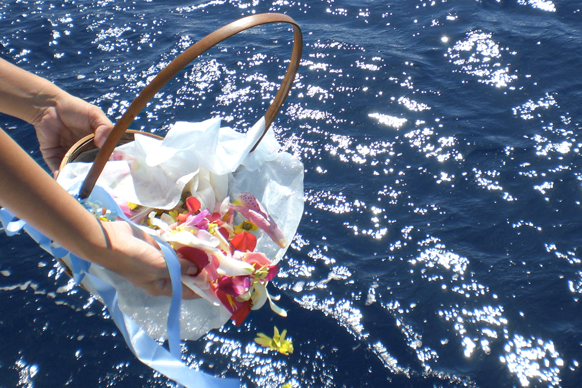 1組で船をチャーターし(貸切)船長、添乗員と同乗して散骨場所まで行き、海洋葬をとりおこないます。